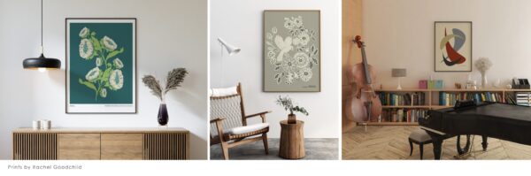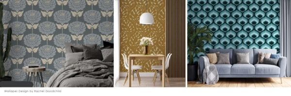 Rachel has always had a love of pattern, and this varies from intricate ornamental designs from the 1700’s, right through to the clean lines and graphic shapes in muted tones, used in Mid Century design. Rachel’s approach is to use a slightly rough, hand-drawn, or hand-cut woodblock style of pattern, together with incorporating simple motifs, as often used in the Arts and Crafts movement.